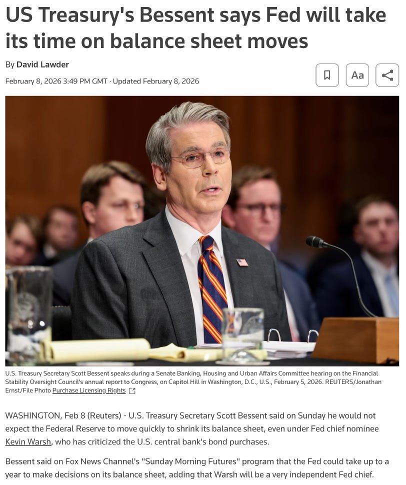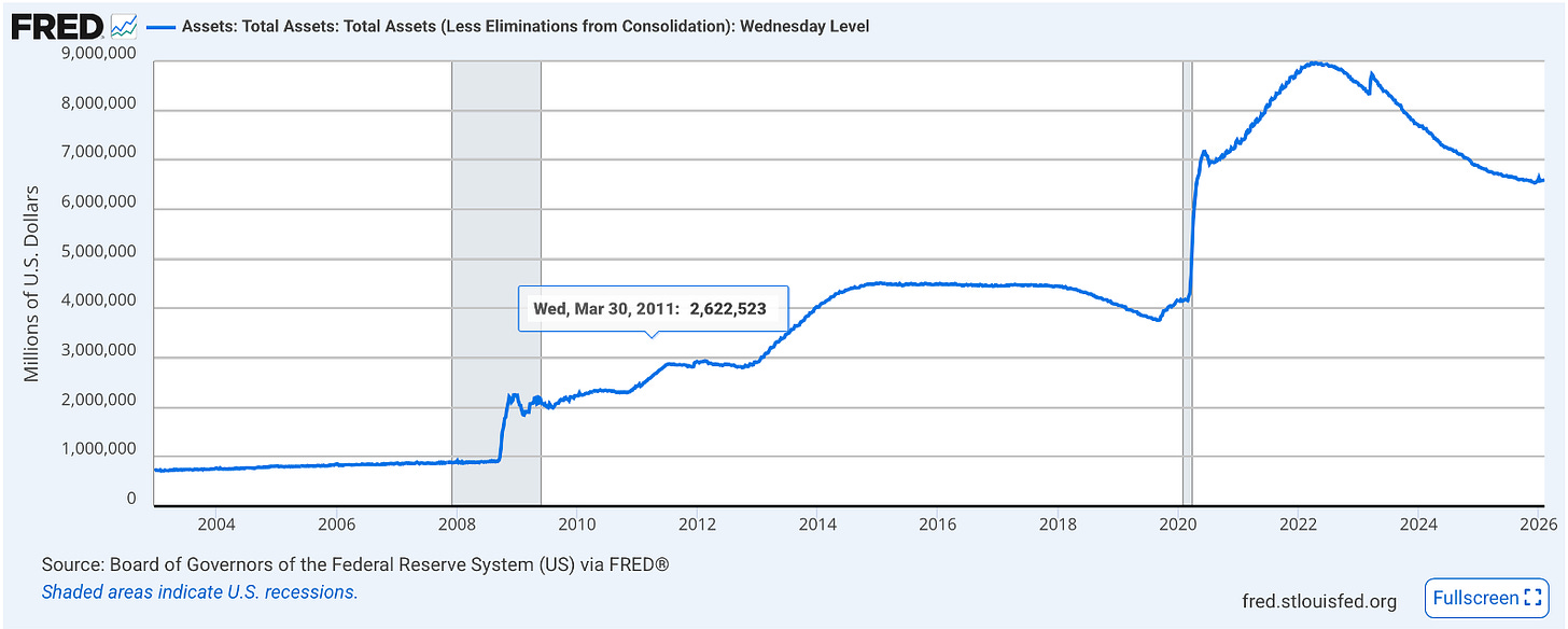 What they can’t easily price is a Fed Chair who might be willing to question the deeper engine of the post-2008 regime: the assumption that the balance sheet only grows in one direction over time.