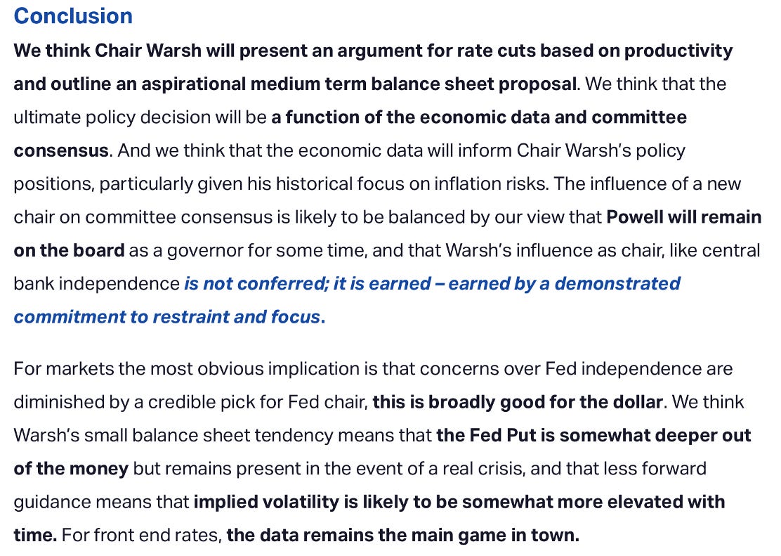 If Warsh gets the seat, our base case is that the cuts come faster and deeper... potentially twice what the curve is implying today. We’ll be here to stand accountable for that call.