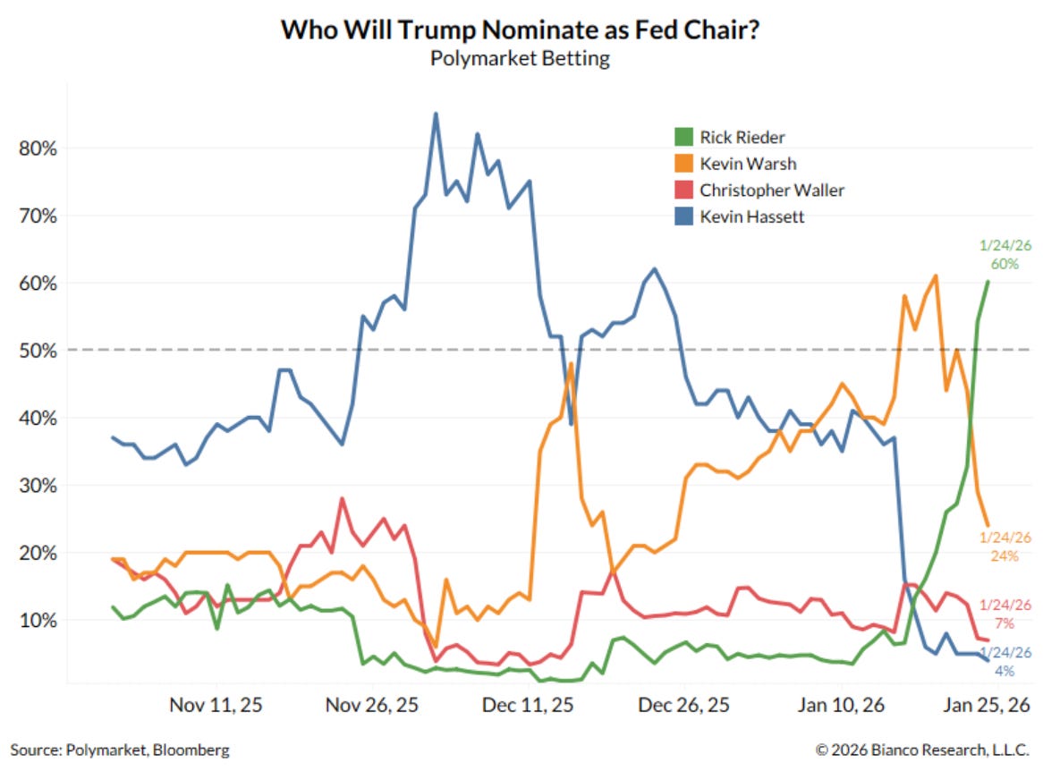 The chart above This chart shows Polymarket’s odds for Trump’s Fed Chair nomination. Prediction markets are becoming increasingly valuable tools (as we’ve noted recently in our Alpha Tier).