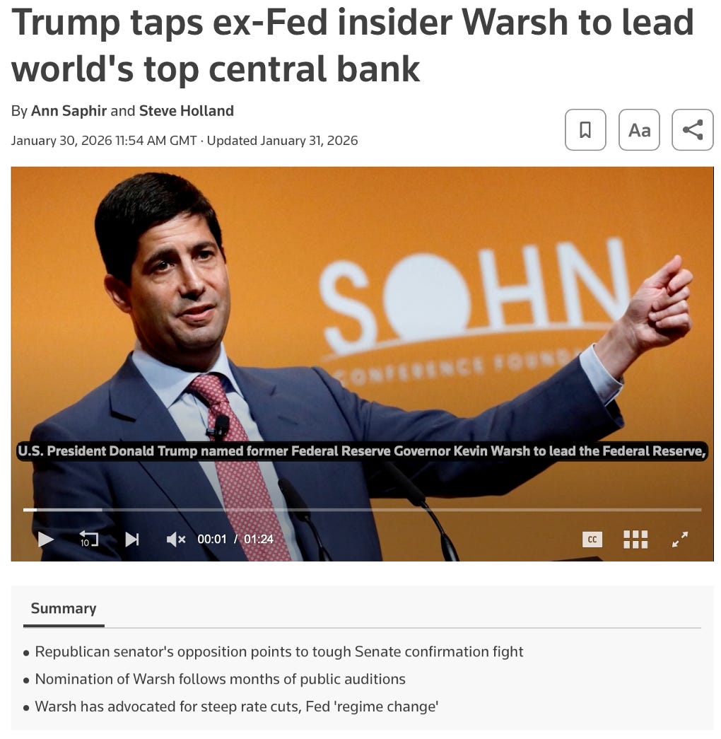 Let’s ask the obvious question one more time: would Trump really nominate someone who plans to frustrate Trump’s own objectives? Trump wants lower rates, easier financial conditions, and a smoother refinancing path into a midterm election. Warsh may dislike a “forever-QE” framework... but that doesn’t mean he won’t act aggressively if the mandate (and the pressure) is clear.