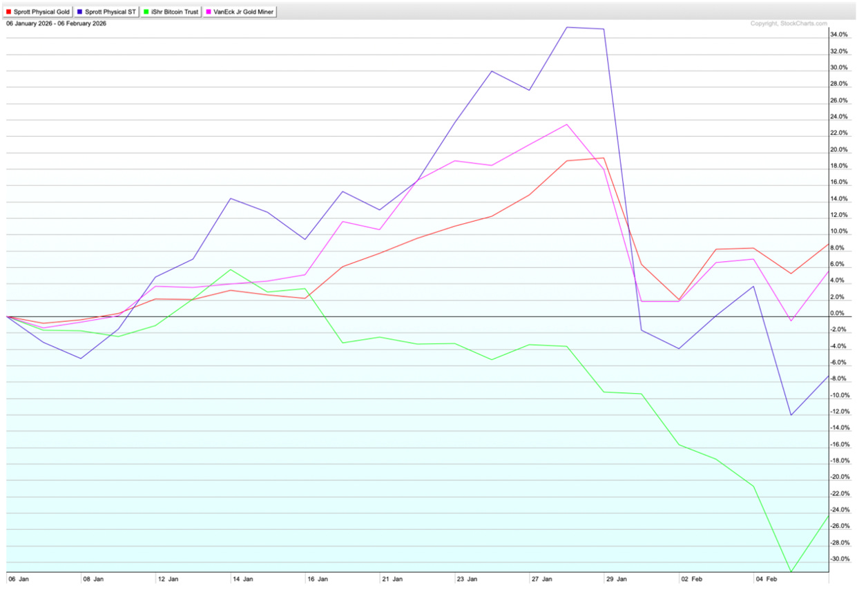 Just check what happened to gold ( PHYS 0.00%↑ ), silver ( PSLV 0.00%↑ ), junior gold miners ( GDXJ 0.00%↑ ) and Bitcoin BIT 0.00%↑ on the very last trading day of January: