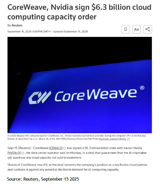 NVDA–Lambda: NVIDIA leases back ~18,000 GPUs after selling chips into Lambda’s cloud (~$1.5B), essentially turning sales into services.