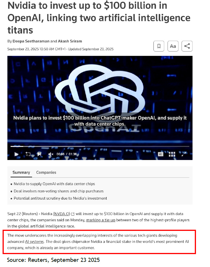 NVDA–OpenAI: plan to build at least 10 GW of AI data centers on NVIDIA systems, with up to $100B of NVIDIA investment tied to each GW deployed. The supplier helps finance the biggest buyer.