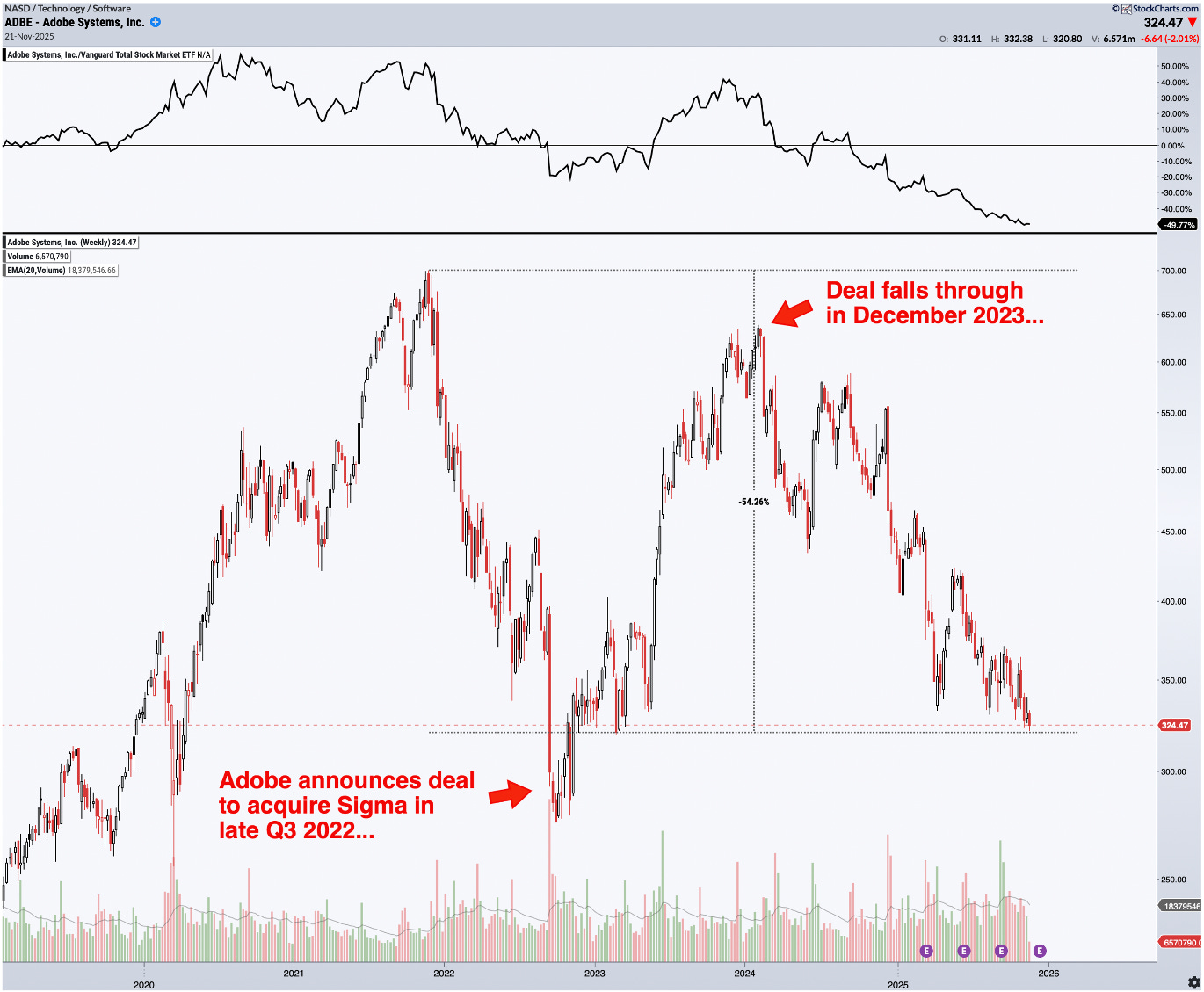 Right now, the dominant narrative is simple and brutal: AI is eating software, and giants like Adobe are on the menu. This fear has driven Adobe’s stock down by more than 50% from its 2021 high.
