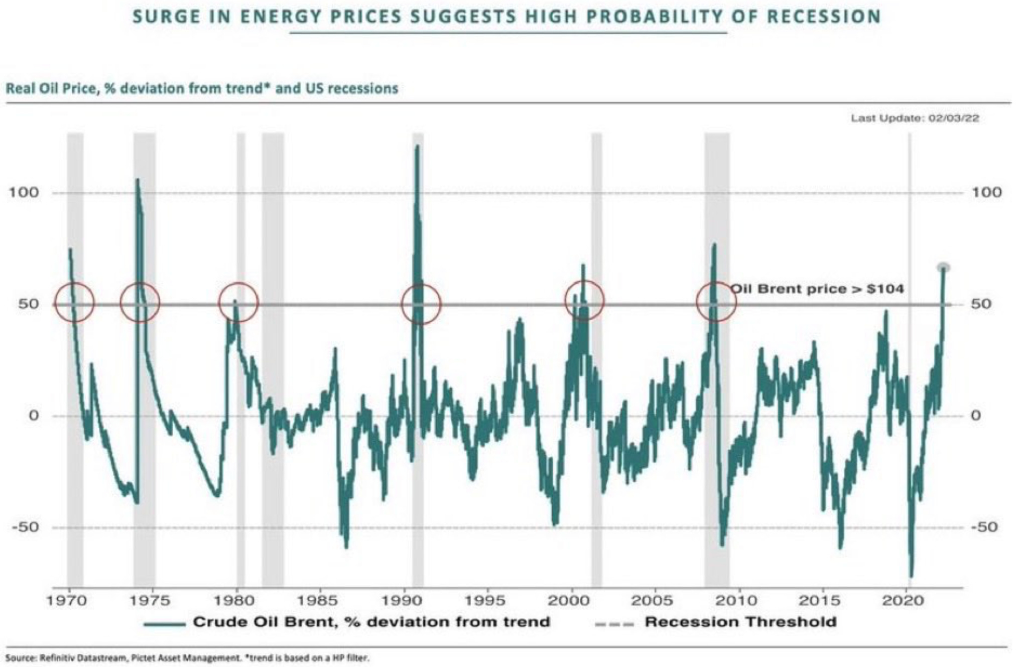 Pictet’s own framework is consistent with that interpretation: the initial pattern is an inflation shock followed by broad portfolio de-risking, while its economists note that a permanent 30% oil shock would lift inflation and drag GDP.