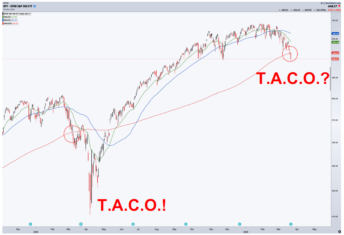 So, here is our working hypothesis: we believe we are moving toward another T.A.C.O. moment... another moment when Trump, faced with rising gasoline prices, rising yields, a stumbling stock market, and a politically costly war, tries to frame the mission as accomplished and pivot toward de-escalation.