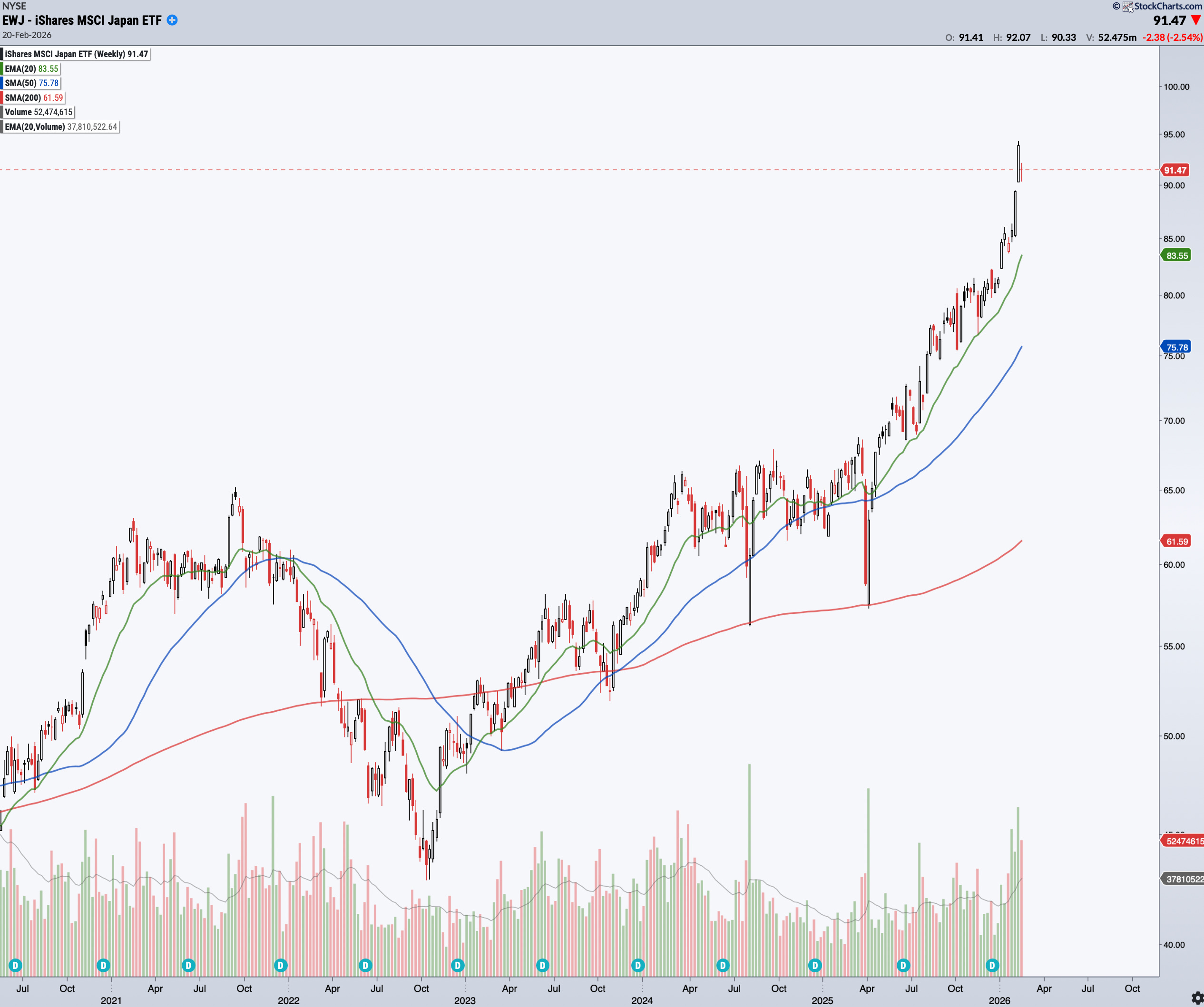 Meanwhile, Brazil (EWZ) and Japan (EWJ) are doing almost the same attention-grabbing thing: they’re going parabolic. Different reasons… same result.